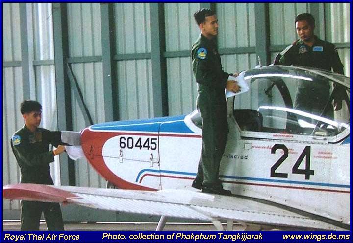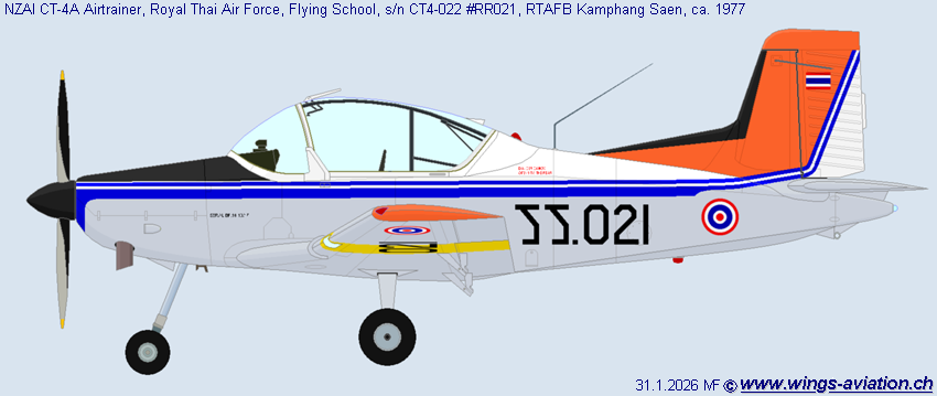 24 CT-4A where delivered in 1973/74 to the RTAF. The primary Trainer was used by the 1. FTS at RTAFB Kamphaeng Saen. In 1992 6 CT-4B where procured. The replacement of the CT-4A and B was the CT-4E from wich it 1999 16 where delivered and 8 more in 2005. The CT-4E ist the Primary Trainer of the RTAF, the CT-4A/B where now in use of the 604 Sqn 6th Wing RTAFB Don Muang. | 24 CT-4A wurden 1973/74 an die RTAF geliefert. Der Basis-Trainer wurde von der 1. FTS in RTAFB Kamphaeng Saen verwendet. 1992 wurdem 6 CT-4B gekauft. Der Ersatz der CT-4A und B erfolgte 1999 mit der Lieferung von 16 CT-4E und weiteren 8 im 2005. Die CT-4E ist der Basis-Trainer der RTAF, die CT-4A/B wird heute von der 604 Staffel 6te Wing in RTAFB Don Muang verwendet. | |||||||||||||||||||||||||||||||||||||||||||||||||||||||||||||||||||||||||||||||||||||||||||||||||||||||||||||||||||||||||||||||||||||||||||||||||||||||||||||||||||||||||||||||||||||||||||||||||||||||||||||||||||||||||||||||||||||||